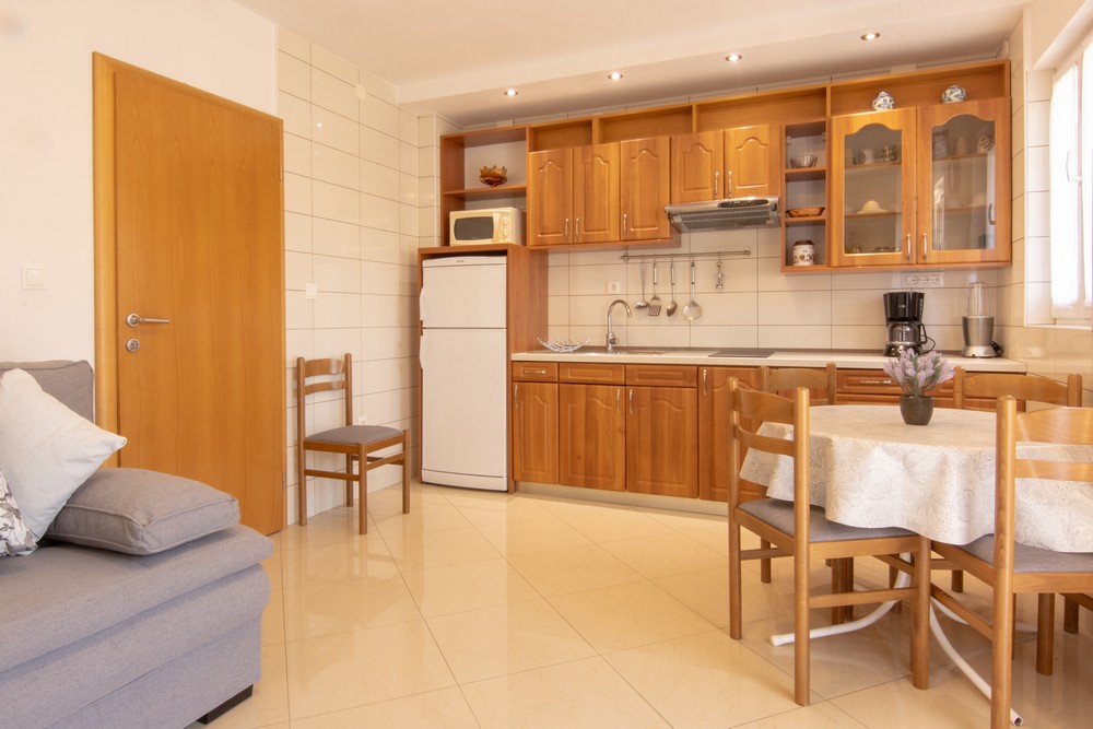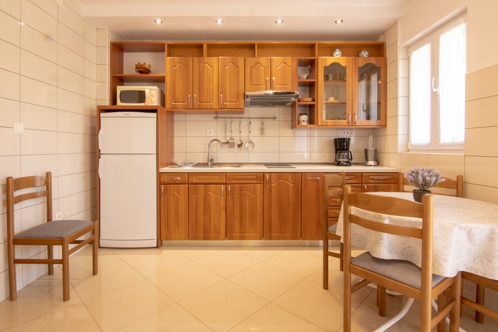 Oprema kuhinje: pećnica, kuhalo, frižider, ledenica, mikrovalna, grijač vode, posuđe i pribor.