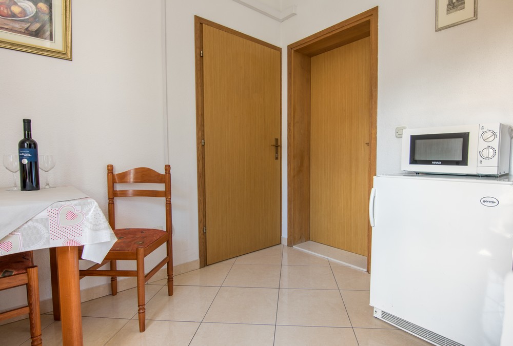 Oprema kuhinje: kuhalo, frižider sa ledenicom, mikrovalna, grijač vode, posuđe i pribor.